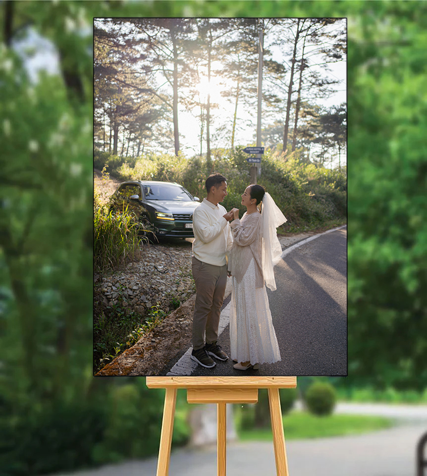 Ngoài ra, mức độ cá nhân hóa rất cao. Cặp đôi có thể in ảnh pre-wedding, câu chuyện tình yêu, câu trích dẫn ý nghĩa hoặc minh họa riêng, giúp cổng cưới trở thành một phần kỷ niệm chứ không chỉ là vật trang trí.