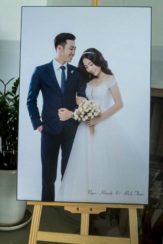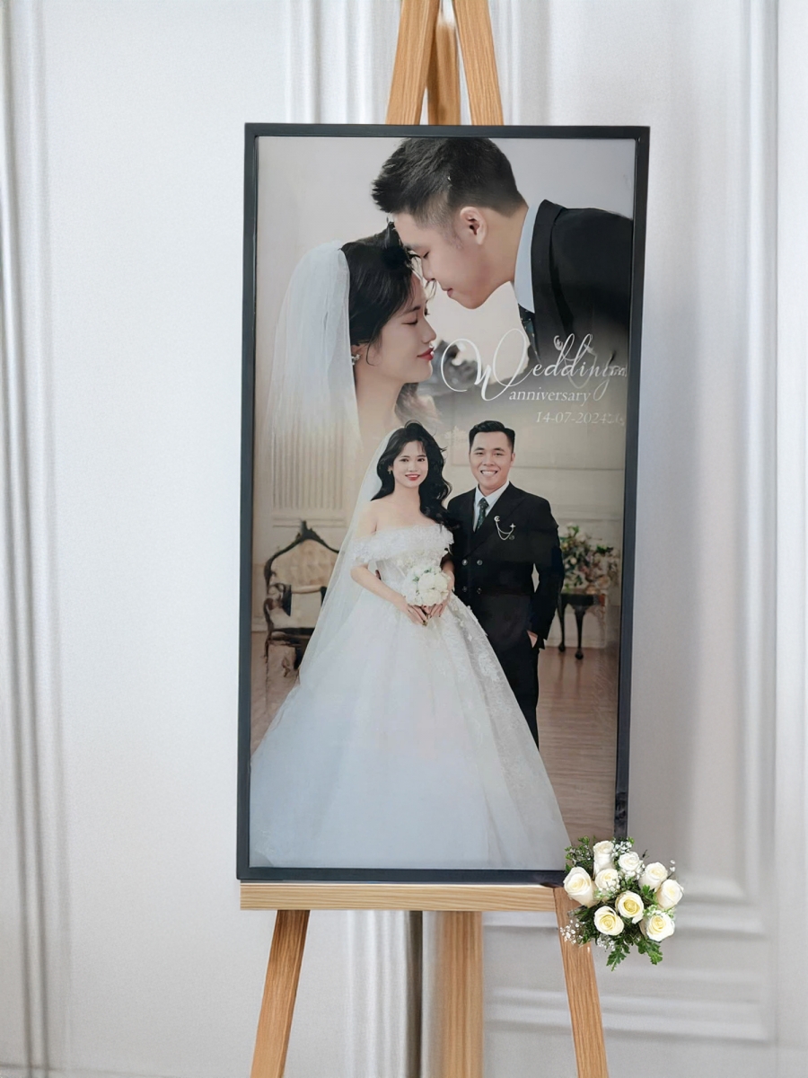 Ảnh cô dâu chú rể, tên và ngày cưới nên đặt ở vùng trung tâm, cách mép trên và mép dưới một khoảng an toàn để khi lắp dựng không bị che bởi hoa nổi hoặc khung đỡ.